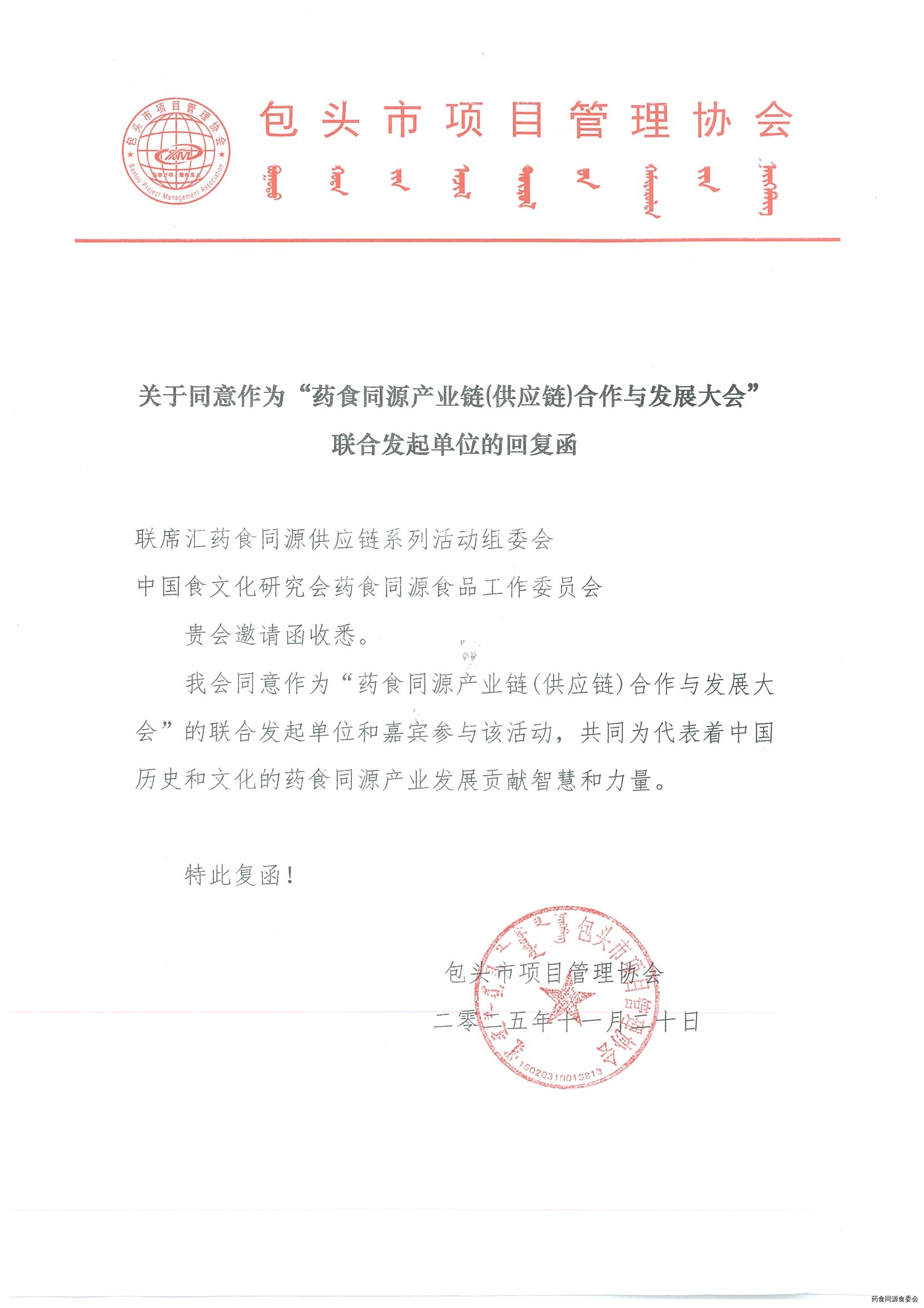 祝贺“包头市项目管理协会”成为“药食同源产业链(供应链)合作与发展大会”联合发起单位!